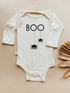 Boo-tifully spooky for baby’s first Halloween. Our BOO organic cotton baby bodysuit features two playful spiders dangling from the O’s — a sweet, seasonal design perfect for fall festivities. Thoughtfully crafted in the USA from luxuriously soft, breathable cotton that’s gentle on sensitive skin. Finished with a lap-shoulder neckline and nickel-free snaps for quick changes, it’s ideal for pumpkin patch visits, trick-or-treat photos, and cozy autumn days.