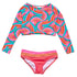 If she's slipping and sliding by the pool, she's going to need some shielding from the summer sun. This on-trend swim set does just that, with a cropped rash guard swim top and contrast bottoms made from our UPF50+ sun protection sustainable fabric.