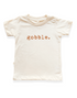 Gobble is a playful, minimal design made to celebrate the warmth and togetherness of Thanksgiving. Whether your little one is helping in the kitchen, dressing up for the dinner table, or playing with cousins, this tee is the perfect festive touch for a heartfelt holiday.