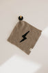 The softest lovey made of microfiber feather yarn. Features a black lightning bolt on a gray background.