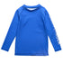 Dive deep in our Marine blue boys' long sleeve rash guard. Protect him from the elements and damaging sun rays with our sustainable UPF50+ certified fabric, and why not pair it with some funky board shorts to complete the look?