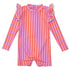 Wrap your little beach-goer in the soft glow of a sunset with this pink striped sunsuit. Adorned with delicate frills trimmed in white mini pompoms at the shoulders, it's crafted for ease with a back zip and secure snap domes, ensuring quick changes between sandcastle building sessions.