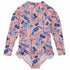Ride the tropical tide in this frilled surf suit, decked out in a lively toucan print perfect for little ocean explorers. It features a handy peach-colored back zip closure for quick changes and fun leg frills that flutter as they play, making every beach day a little brighter.