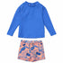 Gear up for seaside fun with this colorful rash top and swim shorts set. The sleek and functional top made of sun protection fabric blocks 98% of all harmful rays and comes in a striking marina blue. The fun toucan print swim shorts channel tropical island vibes. Spot your little one easily on the beach or in the pool with this set.