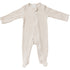 These are our new ribbed footed baby pajamas. They are made out of an Organic Cotton ribbed fabric and are done up with a zipper. This features a double zipper that zips from the top and bottom meant for easy diaper changes. We have a lot of gender neutral options making them great for all babies. The functionality of these zippers make them a baby essential.